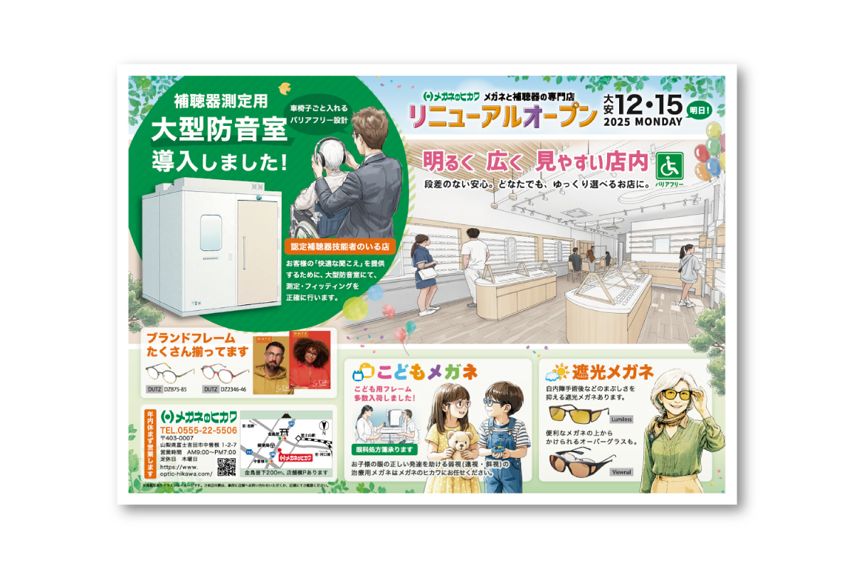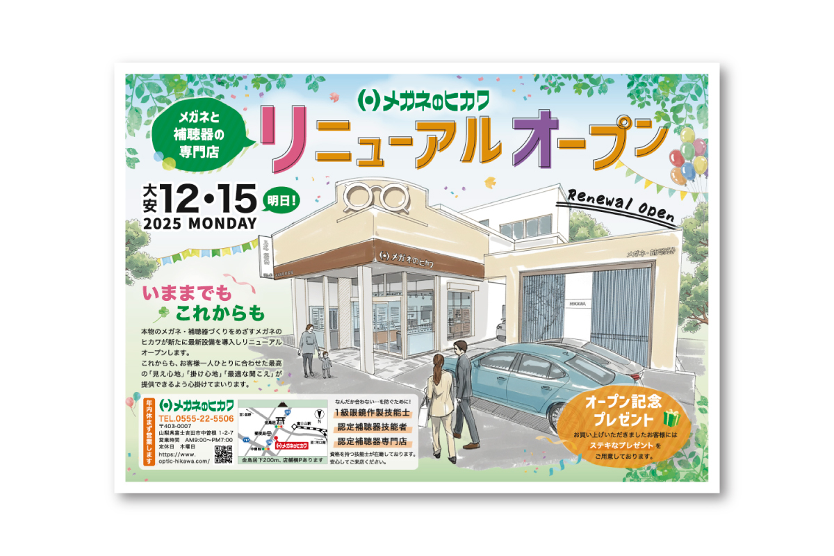本日は、山梨県富士吉田市に店舗を構える「メガネのヒカワ」様のリニューアルオープン広告をご紹介いたします。